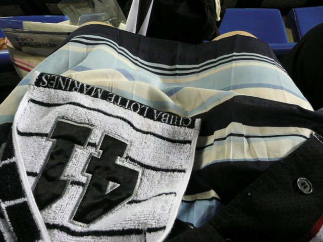 上着はロッテユニフォーム「誠」、タオルは小林宏之タオル、首には福浦のチケット入れをかけています。